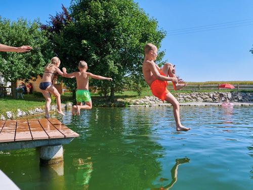 Wir bieten ein angenehmes Ambiente mit reichhaltigem Frühstücksbuffet und geselligen Grillabenden. Unser Naturschwimmteich mit großer Spiel- und Liegewiese, Riesentrampolin, Kinderspielplatz und Kinderfuhrpark sorgen für Spaß und Abwechslung. Diese finden Sie ebenso in der großzügigen Spielscheune mit Tischtennis, Kicker, Billard und Bällebad. Ruhe zum Wohlfühlen und Entspannen bietet der gemütliche Wellnessbereich mit Heuboden- und Kräutersauna.