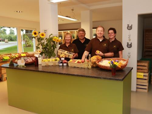 Wir betreiben einen Hofladen mit einer großen Auswahl gesunder Nahrungsmittel. Beginnen sie Ihr Frühstück mit frischem Obst aus unseren Obstplantagen. Bei uns gibt es Äpfel, Birnen, Kirschen, Pflaumen, Himbeeren, Erdbeeren, Johannisbeeren und sogar eigene Pfirsiche. Außerdem führen wir Dosenwurstspezialitäten, Kartoffeln, Weine aus der Umgebung sowie eigene Edelbrände und Liköre.