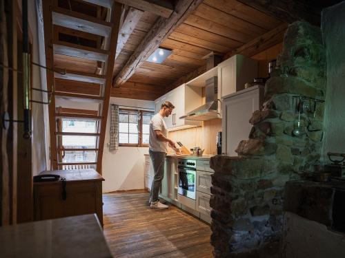 Die Saustall-Ferienwohnung hat Ihren Namen ganz einfach daher, weil bis November 2001 an dieser Stelle unser Schweinestall stand. Die Ferienwohnung wurde von Januar bis März 2019 komplett renoviert, ist weitestgehend mit Holz ausgebaut und besteht ausschließlich aus Naturmaterialien. Wie überall haben wir auch hier die Heizung als Wandheizung in Lehmputz verlegt. Eine wohlige Strahlungswärme umgibt Sie so täglich. Die Einbauküche ist komplett eingerichtet mit Geschirr, Töpfen und Pfannen (ohne Lebensmittel wie Gewürze, Essig und Öl). Für den ungetrübten Kaffeegenuss stehen ein Seco Vollautomat sowie eine Filtermaschine zur Verfügung.