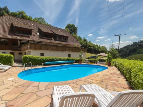 Die gemütlich und komfortabel eingerichtete Ferienwohnung befindet sich im Dachgeschoss und besitzt einen überdachten und windgeschützten Balkon mit Aussicht über den ganzen Hof. Komplett ausgestattete Küche, Wohnzimmer mit großer Couchgarnitur und Essecke im Schwarzwaldstil. Zwei Schlafzimmer: ein Schlafzimmer mit Doppelbett und ein Schlafzimmer mit Etagenbett und Einzelbett. Ein zusätzliches Babybett kann beigestellt werden. Bad mit Dusche, separates WC.