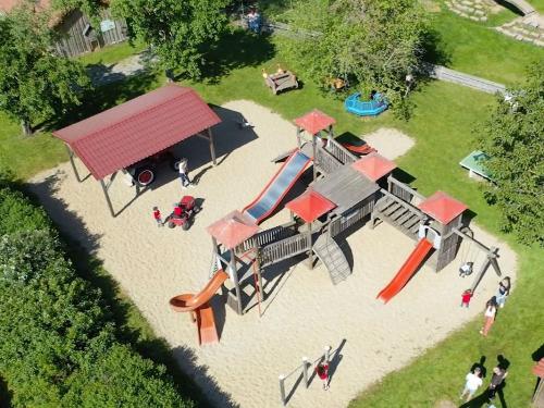 Die Spielscheune mit Ritterburg und vielen Fahrzeugen, das Kletterparadies „Wilder Westen“ mit Grillplatz und die große Seilbahn laden zum Spielen und Verweilen ein.