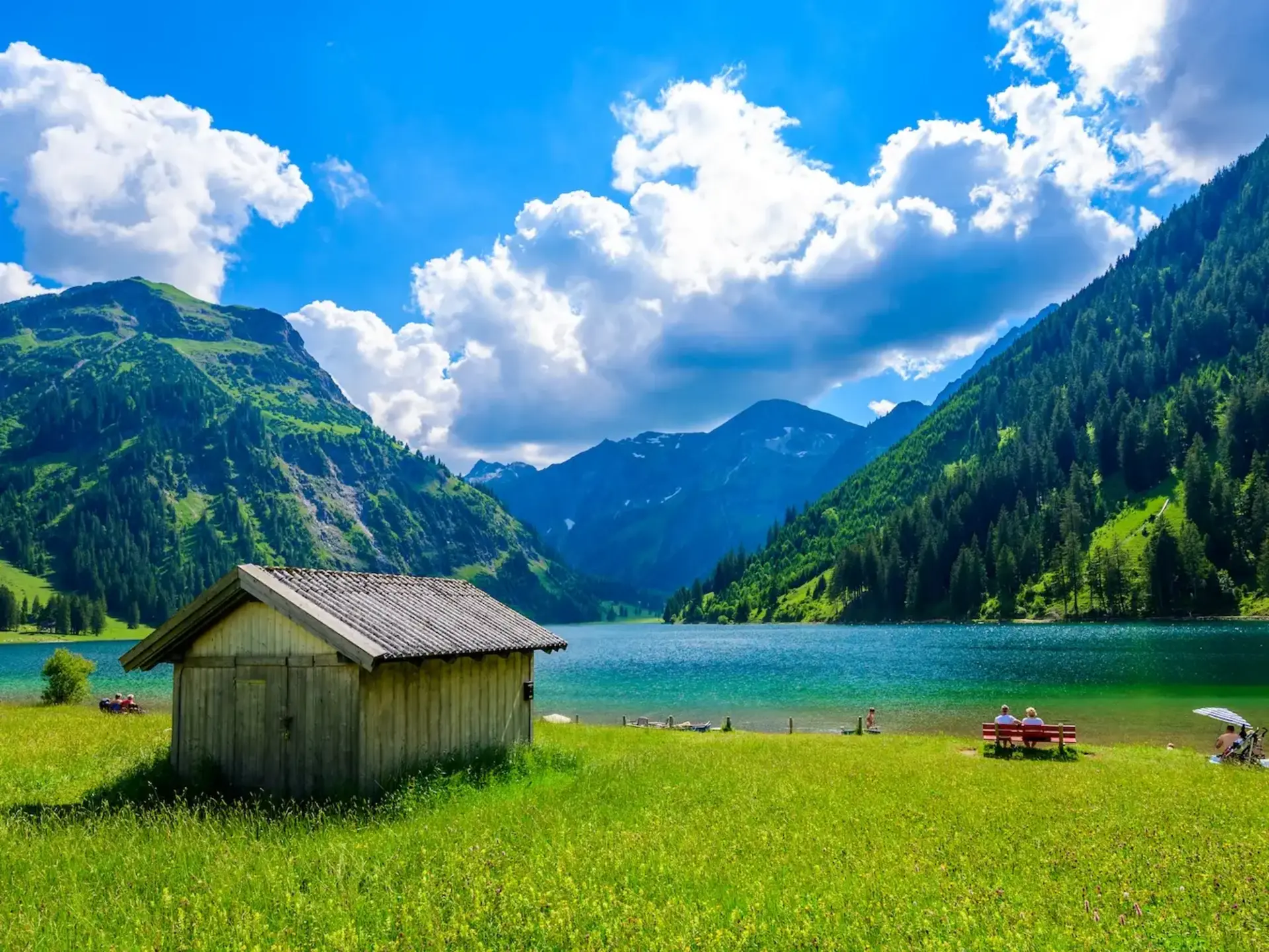 Natur auf 1.100 Metern Höhe: Klare Bergseen wie Vilsalpsee und Haldensee, grüne Almwiesen und die Gipfel der Allgäuer Alpen prägen die Landschaft.